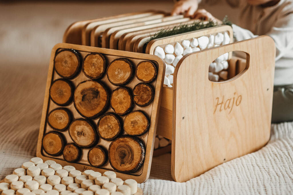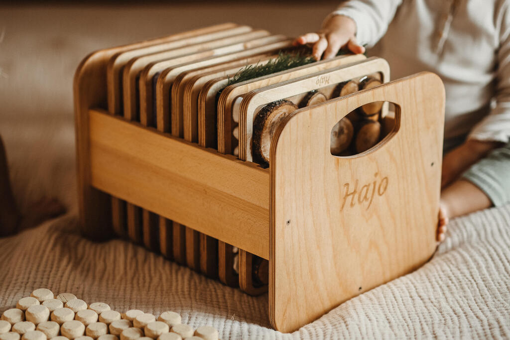 Skrzynia posiada dedykowane miejsca na każdy panel, co ułatwia organizację zestawu w przedszkolach, gabinetach terapeutycznych oraz szkołach.