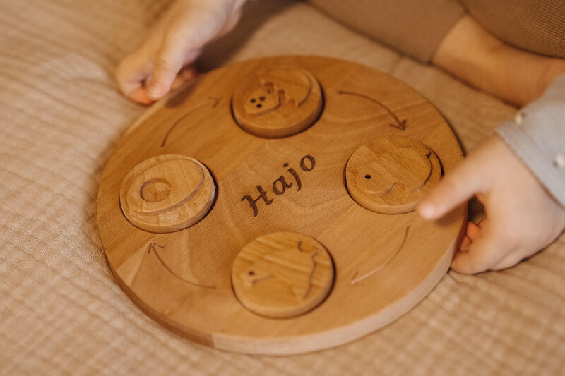 Dostępne w dwóch różnych opcjach – zestaw z woreczkiem lub z drewnianą tacą do cykli życia. Oba warianty gwarantują solidność i trwałość, dzięki zastosowaniu olejowanego drewna. Własnoręczne wykonanie sprawia, że stempel może być używany z ciastoliną, piaskiem kinetycznym otwierając przed dzieckiem nowe możliwości kreatywnego eksperymentowania.