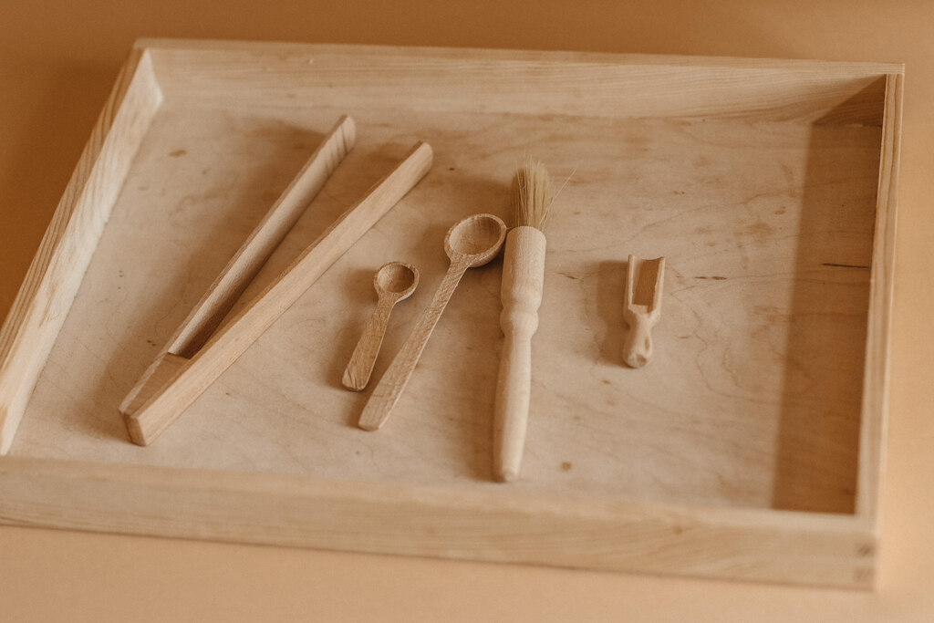 Drewniana taca z drewna sosnowego 30×40 cm wraz z akcesoriami do przesypywania/ przenoszenia: